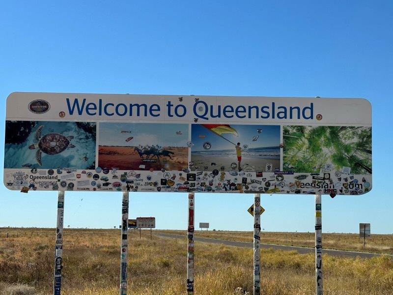We crossed the border between the Northern Territory and Queensland, west of Camooweal.  The stickers on the sign is evidence of a road well travelled.