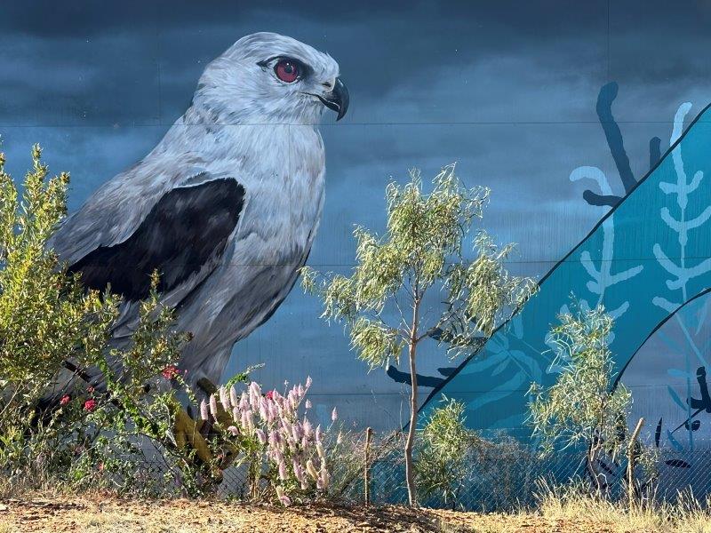 In the center of the city is a lookout adjacent to the town’s water tank.  On the tank is a massive mural of a Black Shouldered Kite.