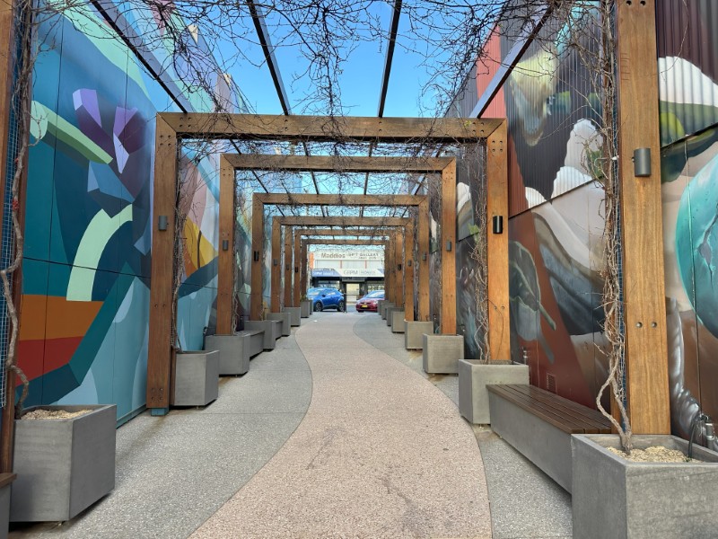 The centre of town has multiple murals and sculptures. The Italian Piazza Mural by Julie Brown, Dean Ford and Laurie Astill, was one of our favourites.