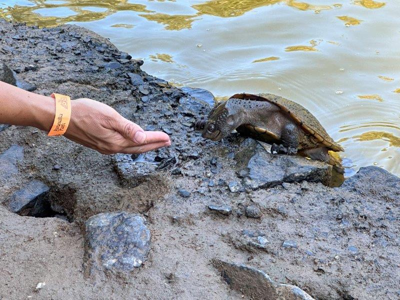 As part of the entry fee, you receive a bag of food to feed the turtles and fish in the river.