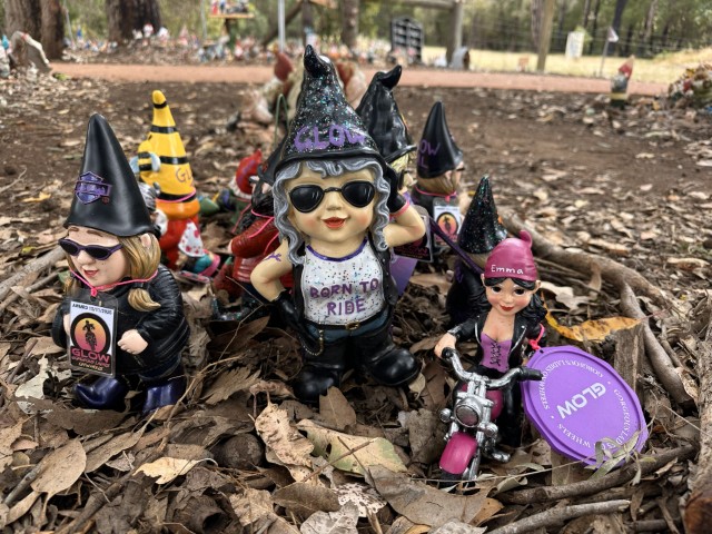 Individuals, families, groups and clubs leave gnomes here as their representatives in Gnomesville. We liked the Gorgeous Ladies on Wheels Bike Club exhibition.