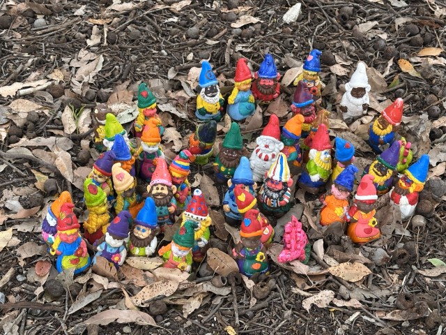 Gnomesville started with Kathleen Rees placing a gnome in a hollow tree trunk, followed by a sign stating “Done Gnoming”. After the sign was installed, a mass migration of gnomes started. Today Gnomesville is often casually referred to as the fastest growing town in Western Australia. There are thousands of gnomes in this little settlement.