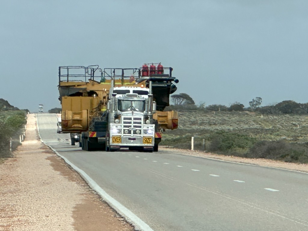 You still need to remain alert for animals crossing, planes landing on the highway and the occasional oversize truck or road train. Luckily we did get and early warning on the UHF radio of this abnormal load heading our way. We had to pull off the highway to allow this mining truck to pass.