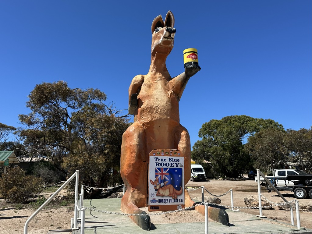 Rooey II, The Big Kangaroo is also at the Border Village with a jar of Vegemite in its forepaw. The 5m high Rooey II started his life with a beer in his paw but as it was apparently sending the wrong message, it was changed to a can of soft drink. The soft drink was changed to a tub of Vegemite in 1986 to promote local products to overseas visitors attending the American Cup regatta hosted in Fremantle near Perth. The poor kangaroo has gone backwards in my estimation.