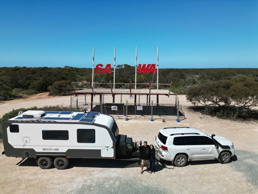 In the weeks before entering Western Australia, we used all the food prohibited from entering Western Australia. After a quick inspection in the car and caravan we were cleared by Quarantine and crossed the border. We stopped on the other side of the border at the border sign for the obligatory photo.