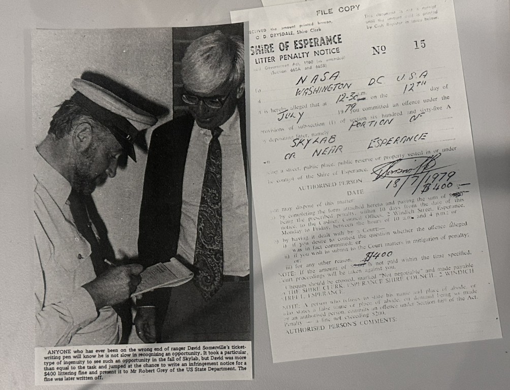 In true Aussie fashion the Shire of Esperance fined NASA $400 for littering. A copy of the fine as well a photo of Ranger Somerville issuing the fine to Robert Grey of the US state Department were also on display.