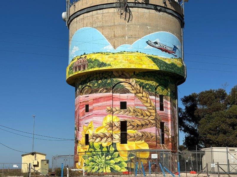 Back on the Yorke Peninsula water tower mural trail we passed many colourful water towers and tanks. The Yorketown water tower features the native flora of the Yorke.