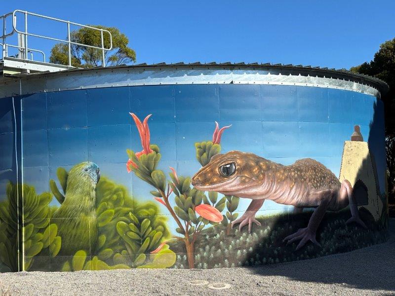 Wool Bay’s contribution to the water tower mural trail is a dam reflecting the local industries and some of the fauna and flora.